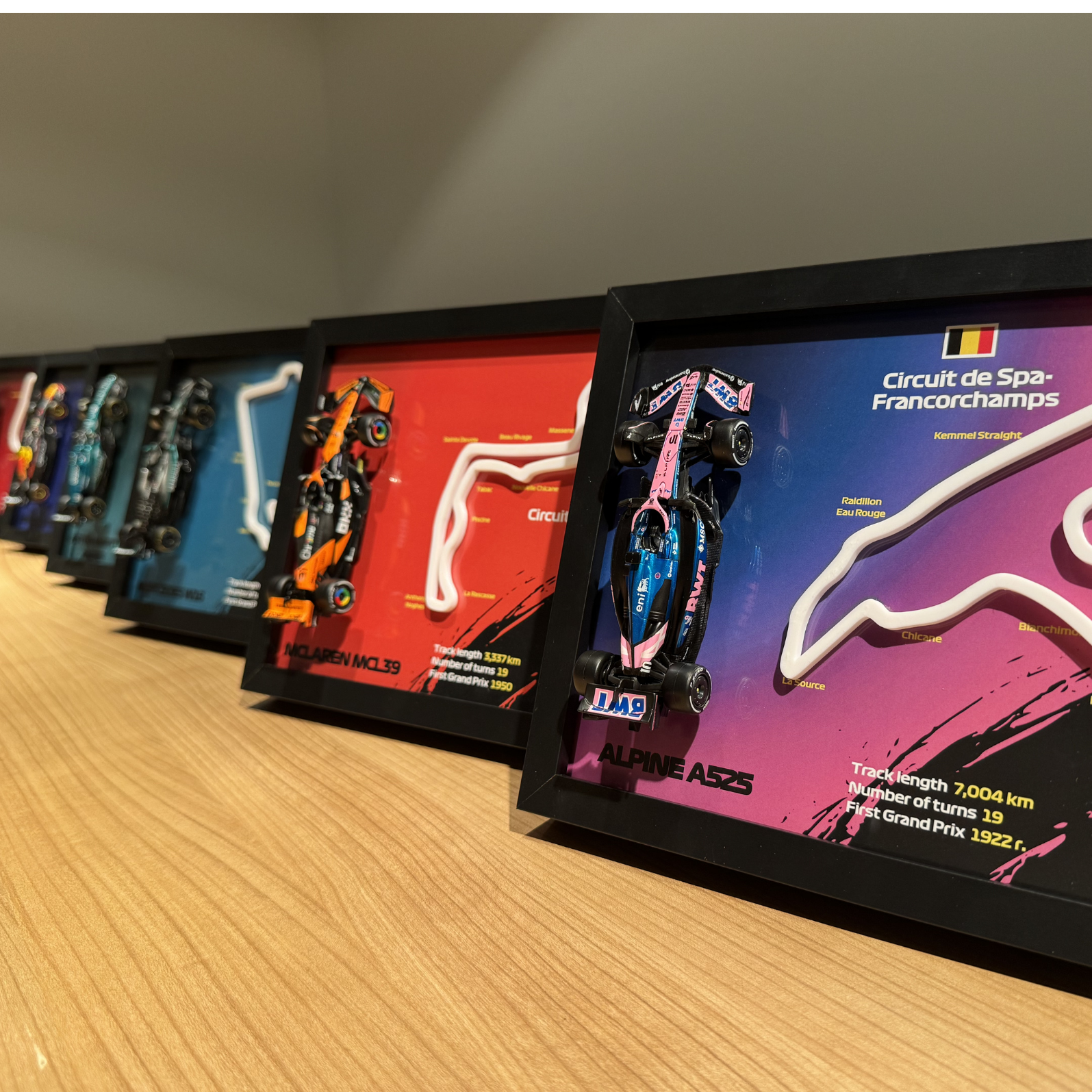 Ramki z bolidami F1 dostępne są w 6 wariantach kolorystycznych, odpowiadających barwom poszczególnych teamów. Modele Alpine, Petronas, Ferrari, McLaren i Red Bull wykonane są z metalu i perfekcyjnie odwzorowują każdy detal prawdziwych samochodów – od elementów aerodynamicznych po charakterystyczne oznaczenia i malowanie.