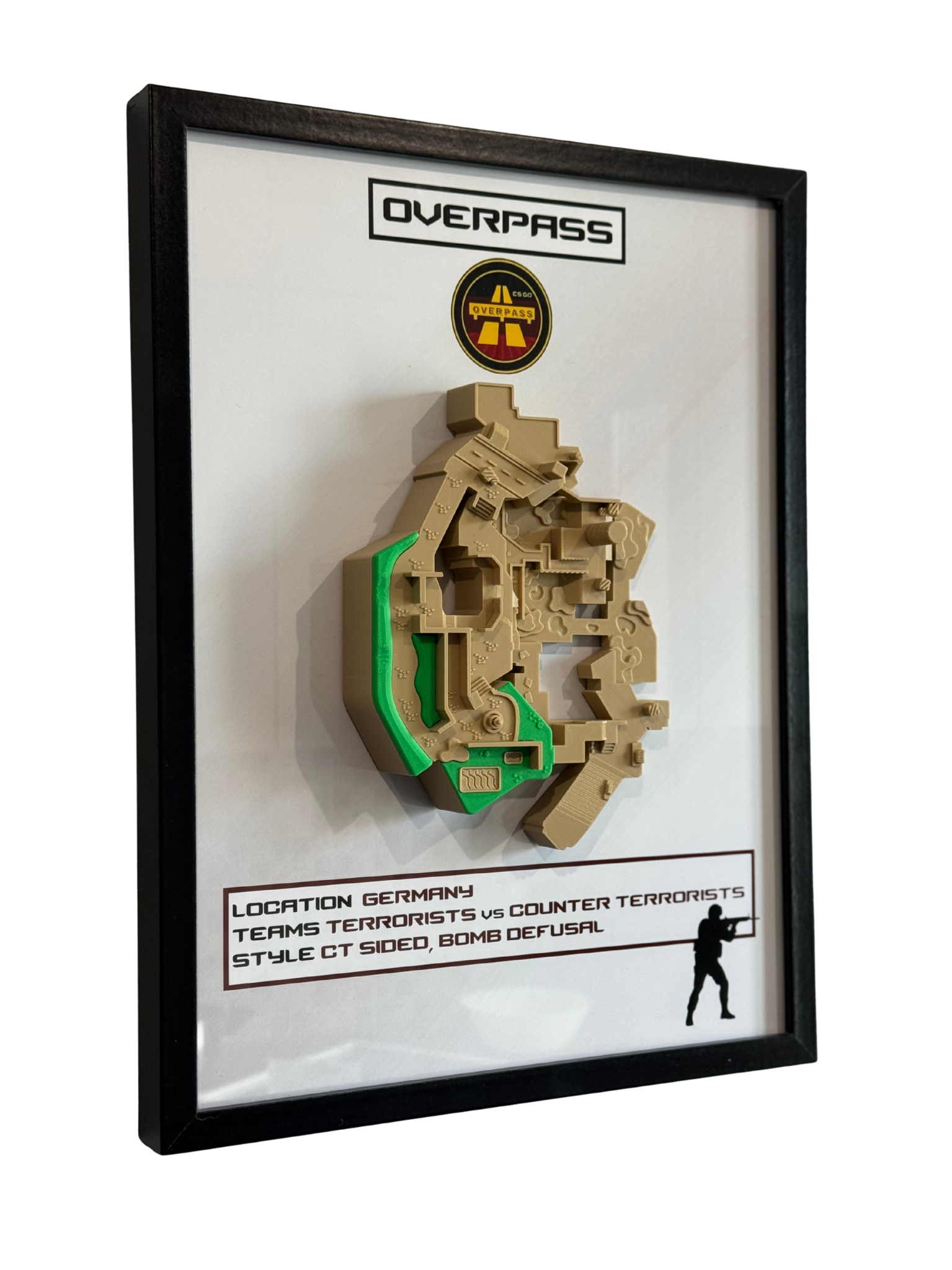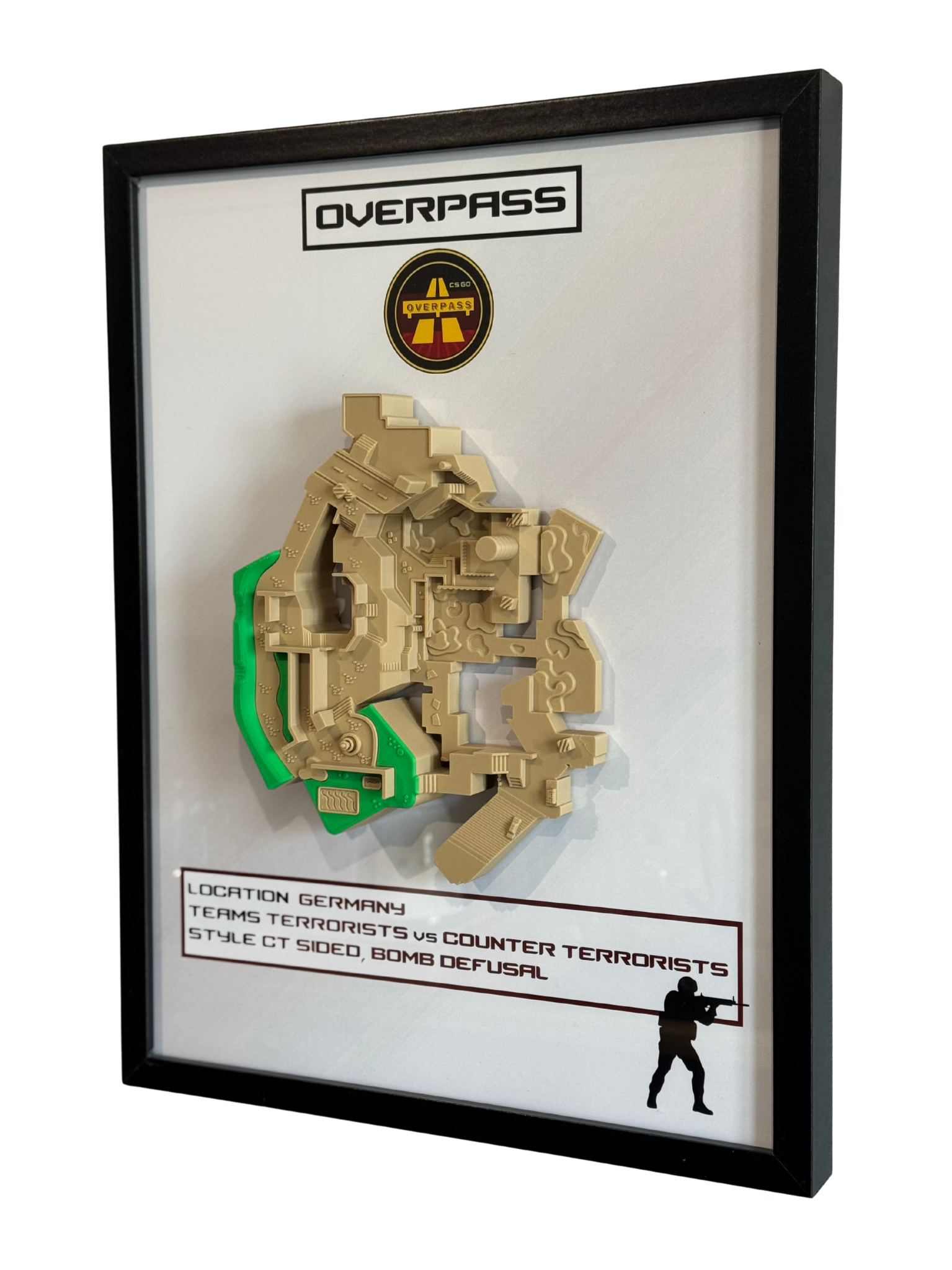 Overpass to mapa, która od lat elektryzuje fanów Counter-Strike’a swoim miejskim klimatem i dynamiczną rozgrywką. Teraz możesz przenieść ją do swojego wnętrza dzięki wyjątkowej dekoracji 3D. Charakterystyczne miejsca, takie jak most, kanały czy bombsite A i B, zostały wiernie odwzorowane w trójwymiarowej formie i umieszczone na szklanej tafli, co nadaje całości elegancji i trwałości. Wszystko to zostało oprawione w klasyczną, drewnianą ramkę o wymiarach 30 × 40 cm, dzięki czemu prezentuje się efektownie w każdym pomieszczeniu.