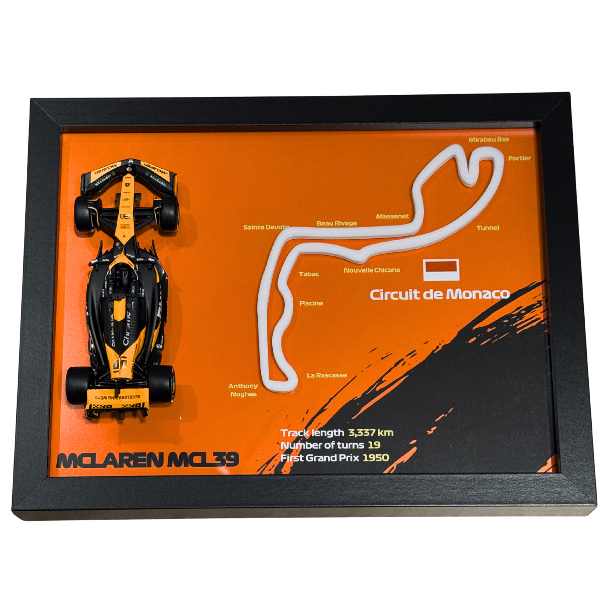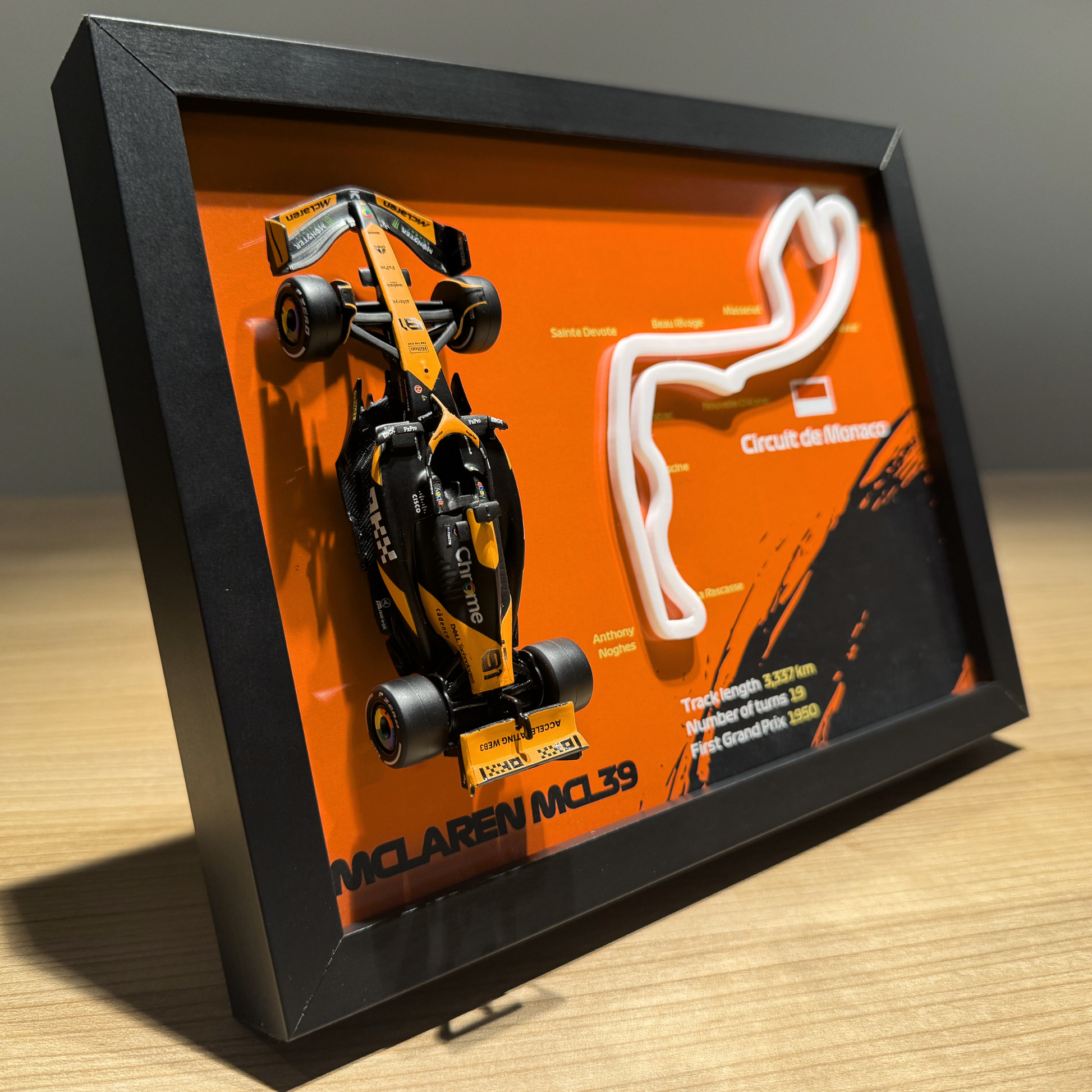 Co kupujesz: Oferta zawiera wszystko, co jest widoczne na zdjęciu – kompletną ramkę z dopasowaną grafiką, zamocowanym modelem bolidu McLaren oraz torem Monaco.