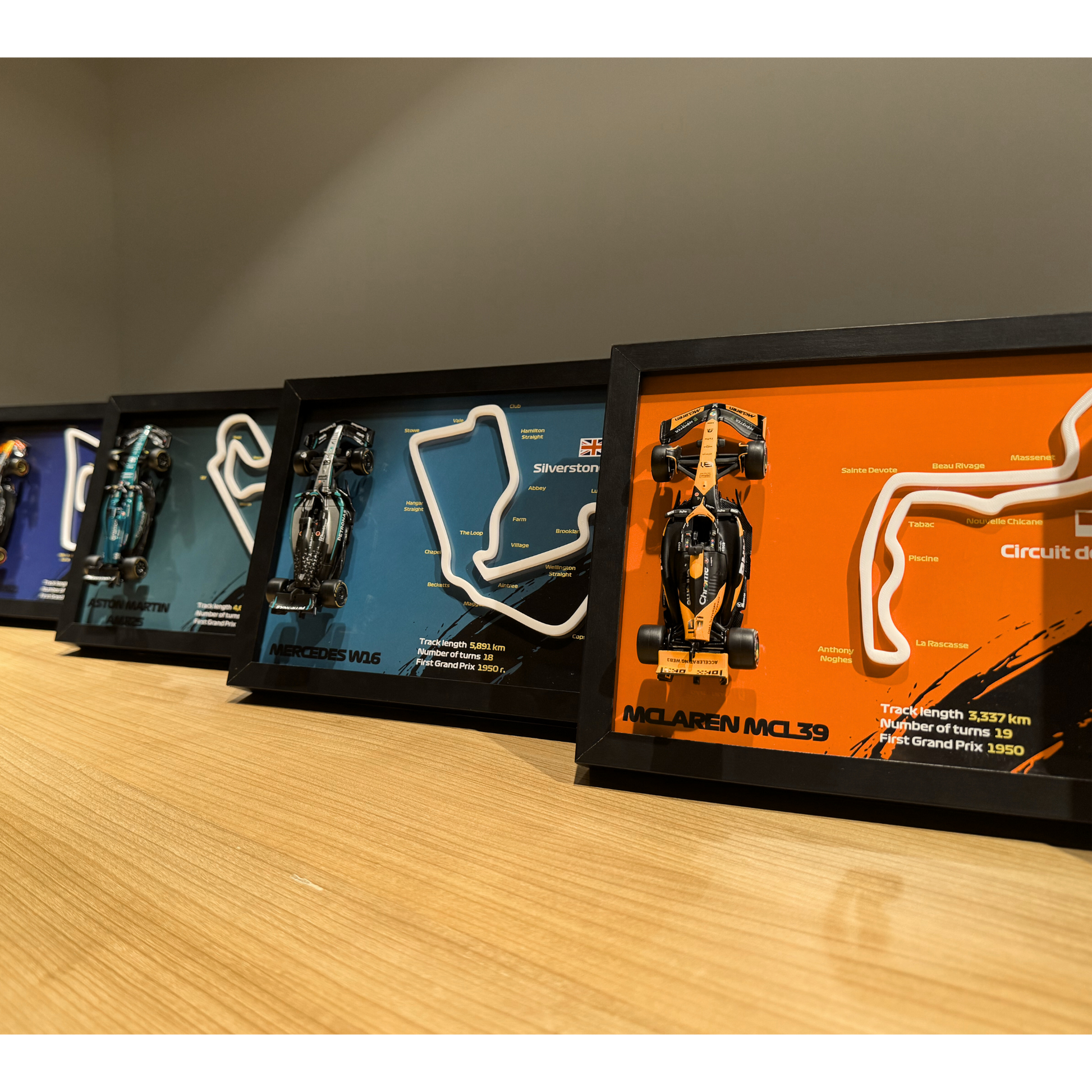 📦 Oferta zawiera: wybrany przez Ciebie model bolidu F1, ramkę z tłem oraz tor wykonany w technologii druku 3D.